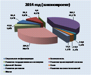 Наиболее значительные объемы бюджетных ассигнований по ФЦП в 2014 году (в сумме 706,9 млрд. рублей, или 81,1 % общей суммы расходов на ФЦП) предусмотрены по направлениям: «Развитие транспортной системы» (41,7 %), «Развитие высоких технологий» (30,4 %) и «Безопасность» (9 %).