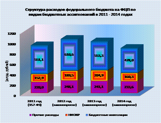 Структура бюджетных ассигнований, предусмотренных на реализацию федеральных целевых программ по видам бюджетных ассигнований в 2011 – 2014 годах, отражена на следующей диаграмме.