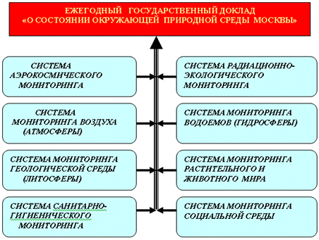На уровне города мониторинг осуществляют посредством систем и подсистем локальных центров в НПО «Радон», МГП «Мосводоканал» и . Обобщенную систему геоинформационного мониторинга городских территорий Москвы можно представить в виде структурной блок-схемы, показанной ниже.