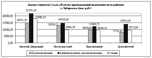 Максимальный средний уровень величины арендных ставок производственных помещений в г. Хабаровске отмечается в Железнодорожном районе – 235 руб. за 1 кв. м в месяц (привлекательность данного района в настоящее время растет). Уровень рыночных ставок аренды за производственные помещения в Центральном районе составил 230 руб. за 1 кв. м, в Индустриальном районе – 216 руб. за 1 кв. м, в Краснофлотском районе – 227 руб. за 1 кв. м и Кировском районе – 223 руб. за 1 кв. м.