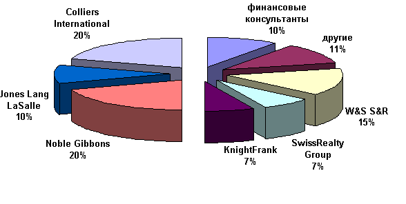 К лидерам Рынка приближаются следующие консалтинговые компании: Knight Frank, Swiss RealtyGroup, DTZ, Paul's Yard, Penny Lane Realty. Также на серьезную долю рынка претендует «большая четверка» международного финансового аудита и консалтинга: Ernst&Young, Deloitte& louche, KPMG и PricewaterhouseCoopers.