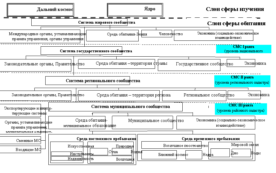 Существует набор границ МС характеризующих разные подходы при решении задач (политических, административных, природных, ареалов обслуживания и трудовых ресурсов и т. д.). Элементы окружающей человека среды характеризуются местоположением и степенью присутствия в них человека, т. е. существует: пространство, куда человек еще не проник; среда постоянного и среда временного пребывания человека. Слои, каждый из которых имеет свою специфику и характеристики, располагаются от центра Земли в следующем порядке: ядро, недра, околоповерхностное пространство, воздушное пространство, космическое пространство (наименования условные). Для выявления объектов кадастрового учета построена блок-схема связей мирового сообщества и сообществ I, II и III рангов (рис.2).