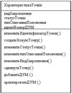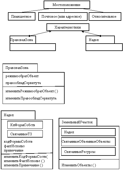 Нотация классов выглядит как прямоугольник с разделами для имени класса, атрибутов и операций. Пакетами называются блоки для управления содержимым модели, а также для осуществления контроля доступа и конфигурации. Пакет «Точка» является начальным корневым пакетом модели «Земельный участок».