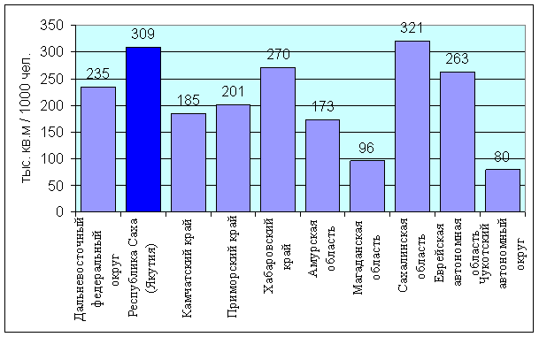 На рис. 2 показаны объемы ввода жилья в расчете на 1000 жителей по субъектам Дальневосточного федерального округа. По этому показателю РС(Я) в течение всех последних лет находилась в лидерах, и только начиная с 2009 года уступила первенство Сахалинской области.
