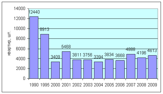 На рис. 3 показана динамика количества вводимых в строй квартир. В последние годы в Республике Саха (Якутия) вводится в строй в среднем 4000 – 4500 квартир.