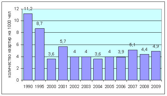 В расчете на 1000 жителей ввод в строй квартир составляет 4,9 квартиры (рис. 4). Это лучший показатель в Дальневосточном округе и в точности соответствует среднероссийскому показателю (по состоянию на 2009 год). По этому показателю максимум в постреформенный период также пришелся на 2001 год – 5,7 квартиры, и затем повторный максимум в 2007 году – 5,1 квартиры.