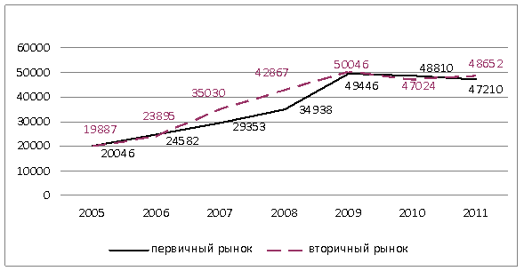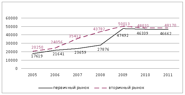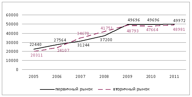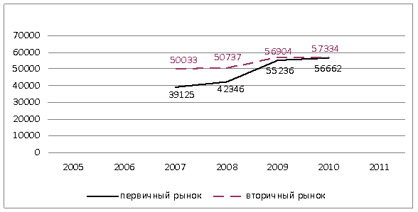 В течение кризисных лет имеет место интересный эффект: если в предыдущие годы цены вторичного рынка (красная линия) превышали цены на первичном рынке (синяя линия), то теперь они почти совпали. В 2010 году цены на первичном рынке даже превышали цены на вторичном рынке. Это все по данным госстатистики.