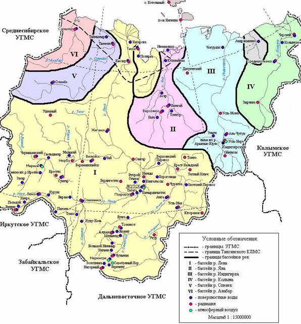 Пункты общегосударственной сети наблюдений и контроля загрязнения среды ведут наблюдения за загрязнением воды и воздуха, отбор проб, консервацию и отсылку в Центр мониторинга для лабораторного анализа (таких пунктов, совмещенных с другими сетевыми организациями, в Якутском УГМС -72).