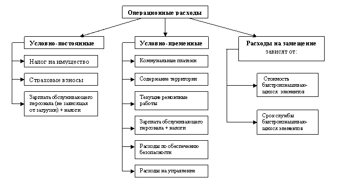 · условно - переменные - это расходы, размер которых зависит от степени эксплуатационной загруженности объекта и уровня предоставляемых услуг (коммунальные платежи, расходы на содержание территории, на текущие ремонтные работы, заработная плата персонала и налоги на нее, расходы на обеспечение безопасности, расходы на управление);