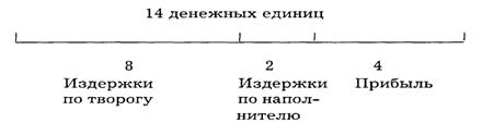 На каком-то определенном этапе мы решаем тот же самый творог производить с ягодно - фруктовым наполнителем (50 г на каждые 200 г творога) и реализовывать его по цене 14 денежных единиц за одну пачку, при этом издержки по приготовлению наполнителя составляют две денежные единицы на каждые 50 г. При этом мы должны учесть, что на изготовление одной пачки творога будет использоваться уже не 250 г, а 200 г и структура цены будет выглядеть следующим образом (рис. 7.11):