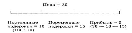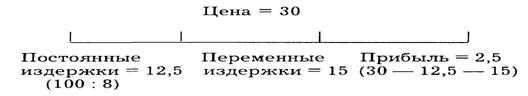 Возьмем пример. Ваши валовые (суммарные) постоянные издержки составляют 100 денежных единиц. Вы производите 10 товарных единиц. Переменные издержки (их норматив) —15 денежных единиц в расчете на одну товарную единицу. В таком случае при цене реализации 30 денежных единиц за товарную единицу структура цены будет следующей (рис. 7.13):