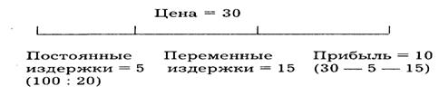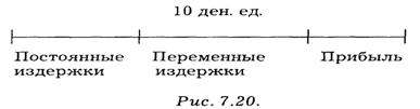 Предположим теперь, что Вы увеличиваете объем производимой продукции с 10 до 20. В этом случае валовые постоянные издержки "разбрасываются" теперь уже не на 10, а на 20 товарных единиц и структура цены меняется (рис. 7.14):