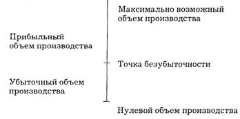 Из приведенной схемы видно, что точка безубыточности делит прямую, отражающую изменение объема производства от нуля до 100%, на две сферы — убыточного и прибыльного производства. Любая точка на отрезке АБ характеризует объем прибыльного производства, и, соответственно, любая точка на отрезке БВ отражает убыточность производства.