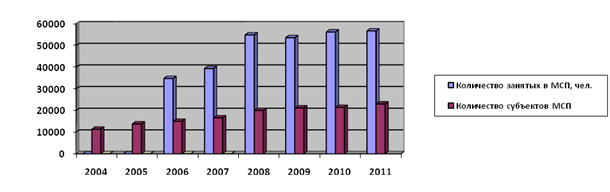 По оценкам МИФНС № 12 по Вологодской области, количество субъектов МСП на конец 2011 года составило 23005 единиц. Возросло число субъектов МСП в период с 2004 по 2011 год, более чем в 2 раза. Данные предоставлены управлением стратегического планирования мэрии города (рис.1)
