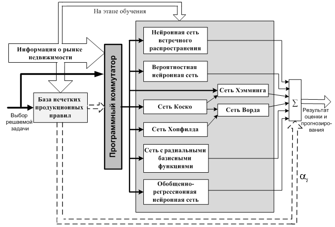 Модуль оценки объектов коммерческой недвижимости реализован на внутреннем языке среды MatLab с использованием разработанных инструментов интеллектуального анализа. Так, на основе результатов анализа характеристик объекта оценки, проводимых в нечетко-логическом блоке, формируются коэффициенты «применимости» частных нейронных сетей, построенных в блоке нейросетевого моделирования. Результаты применения частных нейронных сетей комплексируются в конечный результат на основе полученных весовых коэффициентов.