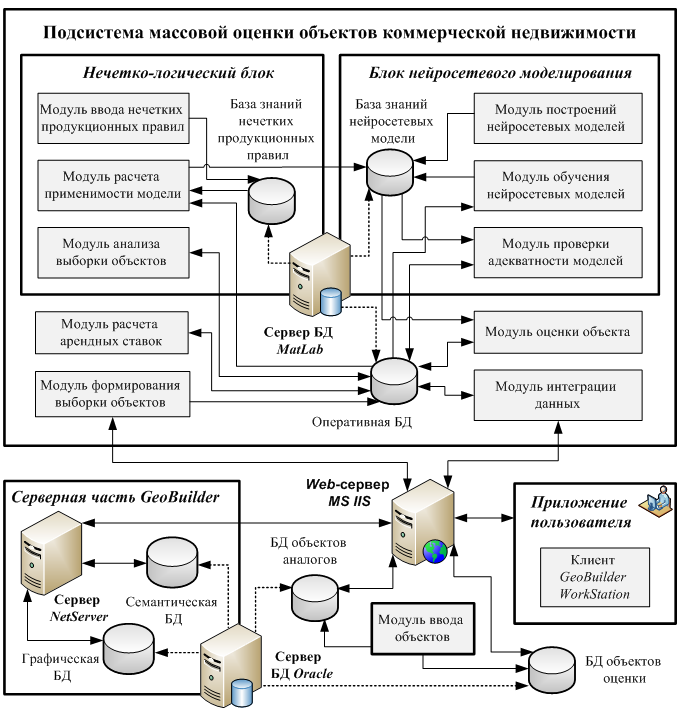 Для визуализации результатов массовой оценки рыночной стоимости объектов коммерческой недвижимости используется геоинформационная система GeoBuilder, разработанная на картографической основе ГУП «Мосгоргеотрест» и адресной базы данных ГУП «МосгорБТИ». В предложенной архитектуре сервер NetServer соединён с Web-сервером MS Internet Information Services (MS IIS) и БД Oracle, которые обеспечивают хранение большого массива векторных и растровых графосемантических данных. Сервер NetServer по запросу получает эти данные, формирует графическое изображение карты и в сжатом виде отправляет пользователю, где оно воспроизводит клиентской частью WorkStation.