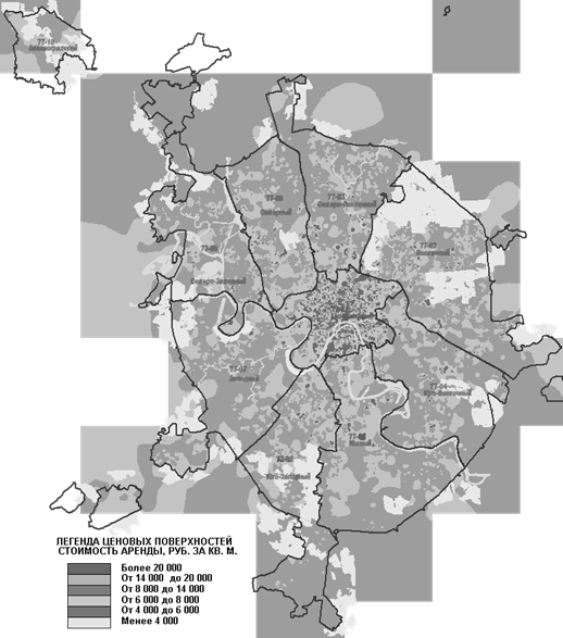 На рисунке 3 приведены результаты массовой оценки арендных ставок в зависимости от расположения на территории г. Москвы, визуализированные с помощью геоинформационной системы GeoBuilder.