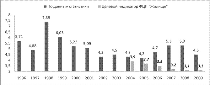 Рис. 1. Динамика коэффицента доступности жилья как и его сравнениес с целевыми индикаторами ФЦП «Жилище». Источник: Институт экономики города, Паспорт ФЦП «Жилище»