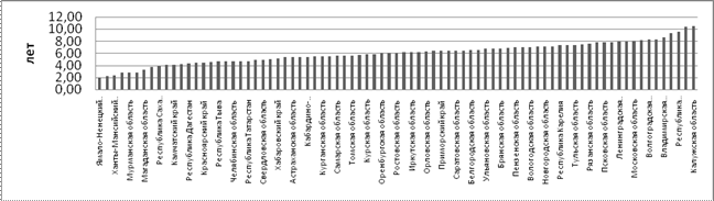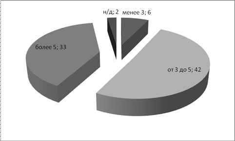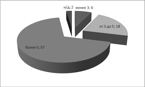 По своей экономической сути данный показатель характеризует лишь один из факторов доступности жилья, а именно соотношение цен на рынке жилья и уровня доходов населения. С этой точки зрения, нормальными в мировой практике считаются значения коэффициента доступности жилья, не превышающие 5 лет[6]. Этим международным границам значений коэффициента доступности жилья в 2008 году соответствовали значения в 42 субъектах Российской Федерации, из которых в 6 регионах для приобретения жилья семье из трех человек надо было копить деньги менее трех лет. В 33 регионах жилье было недоступно, так как период накопления составляет более 5 лет. На рис. 2 приводится количество субъектов Российской Федерации, значения коэффициента доступности жилья для которых попадают в указанный диапазон.