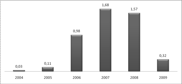 КДЖ показывает, сколько лет потребуется такой семье для приобретения жилья при существующем у неё уровне дохода. Показатель доступности жилья - один из ключевых индикаторов, широко применяемый в мировой практике. В частности, он используется в межстрановых сравнениях в Программе ООН по развитию населенных пунктов[5]. Так, значение КДЖ, по данным 2004 года, составляло: в Сиэтле - 3 года, в Лондоне - 4,7 года, Эдинбурге - 3,5 года, Нью-Йорке - 2,7 года (в целом по США - 2,85 года), Стокгольме - 6 лет, Токио - 5,6 года, Амстердаме - 7,8 года, для Парижа - 3 года, для Мельбурна - 3,6 года, для Рио-де-Жанейро - 2,5 года, Конечно, в разных странах речь идёт о жилье разного качества, но, тем не менее, признаваемом в данном обществе допустимым (средним, массовым) стандартом проживания. Динамика КДЖ для Росси показан на рис. 1.