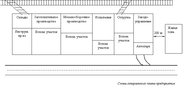 Для строительства предприятия выбирается участок, к которому можно подвести транспортные коммуникации, площадью примерно в три раза большей площади цехов. При этом обеспечивается последовательность расположения заготовительного, механообрабатывающего, сборочного и испытательного производств по ходу технологического процесса. Вблизи производств располагаются их вспомогательные участки. На территории предприятия может также располагаться инструментальное производство, ремонтное, а также обслуживающие и подсобные подразделения. При этом соблюдается экономия длины электросетей, транспортных коммуникаций, создаются дополнительные площади для расширения производства. На территории предприятия, а также за его пределами располагается складское хозяйство.