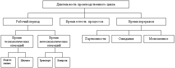 Производственный цикл – это календарный период времени с момента запуска сырья в производство до полного изготовления готовой продукции. Длительность производственного цикла зависит от трудоемкости, размера партии, продолжительности перерывов и нетехнологических операций, организации движения деталей.
