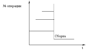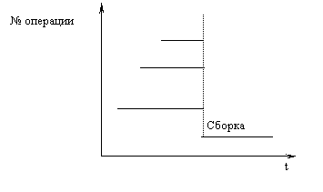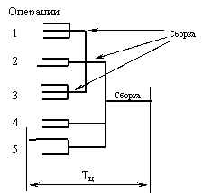 Производственный цикл организуется на базе последовательного, параллельного и параллельно-последовательного движения партий деталей по операциям. На схеме показано: три операции идут параллельно и заканчиваются сборкой детали, аналогично параллельно идут другие операции, заканчивающиеся сборкой соответствующих деталей. Из деталей собираются узел, параллельно изготавливаются и собираются детали 4 и 5. Изготовление завершается сборкой узла[1].