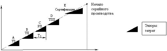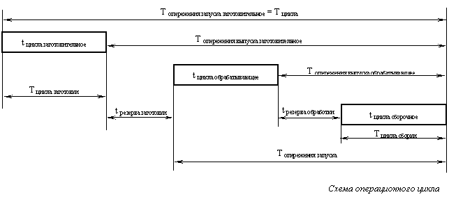 Длительность операционного цикла изготовления разделяется на три цикла: Т цикла заготовления – время выполнения заготовительных операций (кузнечное, литейное, штамповое, прессовое и т. п.), Т цикла обрабатывающее – время механической обработки деталей, включая термические, гальванические процессы, Т цикла сборки – время сборки деталей, узлов и изделия в целом. Между циклами существуют резервы времени, во время которых детали находятся на промежуточном складе. Начало каждого из циклов отсчитывается в обратную сторону от планируемого срока выпуска готовых изделий, отсюда возникает название опережения запуска выпуска (например, опережение запуска заготовительного цикла – это время от начала заготовительного цикла до выпуска готового изделия).