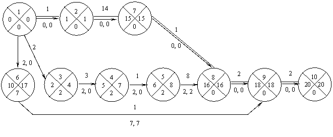 У событий, имеющих «0» резервы времени, ранние и поздние сроки совпадают, то есть событие является критическим и нарушение сроков его наступления изменит общую продолжительность работ. Путь, проходящий через критические события, называется критическим.