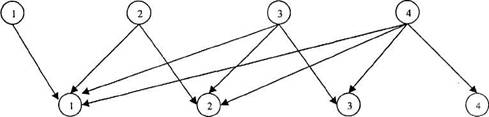 Частный случай I. Пусть существует упорядочение решений jb j2, ... jn такие, что каждое предыдущее необходимо для всех последующих. Так, для рассмотренного выше примера (рис. 9) соответствующее упорядочение - (4, 3, 2, 1). Построим сеть в масштабе времени следующим образом. Вершины сети