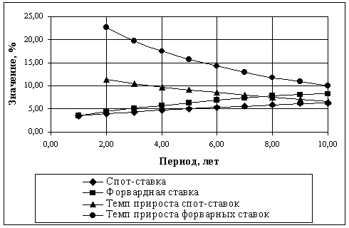В соответствии с этой зависимостью, средний темп изменения ставки доходности, например, Еврооблигации с 5-ти летним сроком погашения, по отношению сроку погашения 1 год, составляет для спот-ставки - 9,4% в год, для форвардной ставки 13,5% в год.