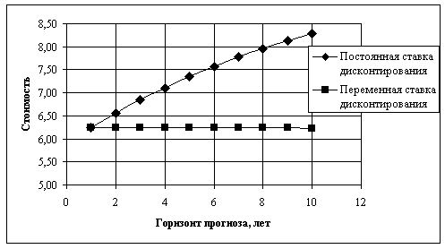 Проведенные расчеты показывают, что стоимость объекта оценки, определенная с применением постоянной ставки дисконтирования, существенно изменяется в зависимости от выбранного горизонта прогноза (в 1,33 раза выше для 10-ти летнего, по сравнению с 1-летним периодом). Стоимость объекта оценки, определенная с применением переменной (возрастающей с постоянным темпом прироста) ставки дисконтирования, практически не зависит (изменение менее 1%) от выбранного количества периодов прогноза. Соотношение стоимостей объекта оценки, определенного разными методами составляет, например, для горизонта прогноза 5 лет – 1,18.
