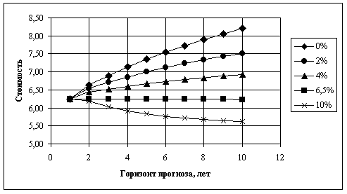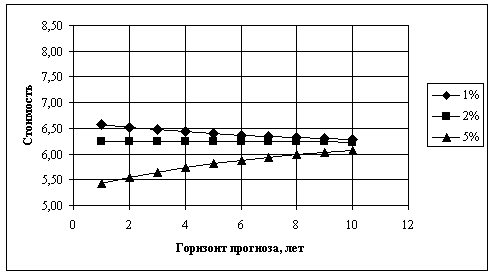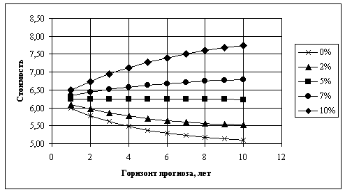 Расчеты так же показали, что изменение величины первоначальных капитальных вложений в диапазоне 0…3 влияют только на абсолютную величину стоимости, которая практически не зависят (изменение менее 1%) от горизонта прогноза.