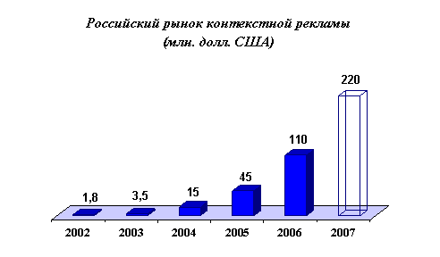 Оборот рынка контекстной рекламы в 2006 г. составил 110 млн. долл. По сравнению с 2005 г. (оборот – 45 млн. долл.) этот рынок вырос почти в 2,5 раза.