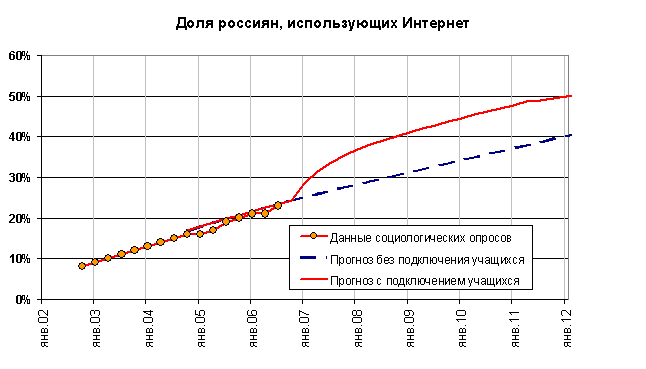 На графике представлен прогноз роста доли россиян использующих Интернет с учетом подключения всех школ к Сети. График построен с помощью эпидемиологической (диффузной) модели распространения Интернета, дополненной т. н. «внешним» воздействием. В данном случае внешней силой является государство, которое предоставляет учащимся возможность подключения к Интернету, а также обучение использованию сервисов Интернета. Предполагается, что все школьники, научившись использовать Интернет, по окончании школы остаются пользователями.