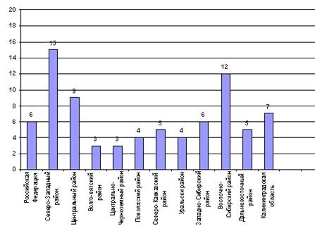 По данным Госкомстата России треть общего количества малых предприятий сосредоточена в Центральном районе, при этом в Москве - 22 %, Санкт - Петербурге - 11 %, Московской, Тюменской областях - по 4 %, Краснодарском крае и Свердловской области - по 3 %, по 2 % - в Новосибирской, Ростовской, Самарской, Кемеровской, Нижегородской областях, Краснодарском крае, Республике Татарстан. В то же время в таких субъектах Российской Федерации, как Ингушская Республика, Республика Тыва, количество малых предприятий не превышает одной тысячи. Если в среднем в 2004 году по стране на 1000 человек приходилось 6 малых предприятий, то в Москве - 21 предприятие, в Санкт - Петербурге - 19,10 - в Тюменской области, 9 - в Республике Алтай. В Республике Дагестан на 1000 человек постоянно проживающего населения действовало лишь одно малое предприятие.