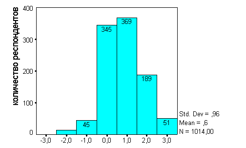 Начнем с вопроса 11 об озабоченности глобальными проблемами. Если считать терроризм и неравномерное распределение богатства чисто социальными проблемами, а загрязнение окружающей среды и истощение природных ресурсов—природно-социальными, экологическими проблемами, то можно построить новую суммарную переменную и провести типологизацию респондентов по степени их тяготения к социальным(отрицательные значения переменной) или экологическим (положительные значения) проблемам. Оценки, близкие к нулю, соответствуют одинаковой степени заинтересованности и теми и другими вопросами, +3 - у тех респондентов, кого вообще не интересуют социальные проблемы, -3 получили бы те, кого вообще не интересуют экологические проблемы, но таких среди респондентов не оказалось.