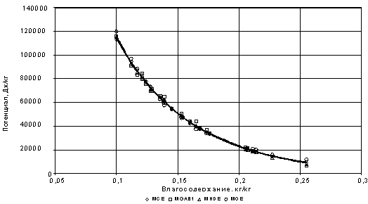 Рисунок 2 - Зависимость потенциала влагопереноса в зерне пшеницы от влажности, рассчитанного с использованием моделей равновесия.