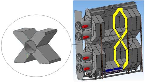 В шестой главе. В соответствии с избранным направлением совершенствования техники сушки путем реализации процесса, работающего по способу с инвертированием взаимодействующих потоков зерна и сушильного агента разработана сушилка схема потоков, в которой представлена на Рисунке 10. За счет размещения внутренних крестообразных перегородок распределительная камера разделена на четыре зоны и двух расположенных по горизонтали отводящих потоков сушильного агента прошедших через движущиеся слои зерна со стороны внешних коллекторов и двух расположенных по вертикали подводящих исходный сушильный агент от топочно – вентиляционных агрегатов. Горизонтально расположенные отводящие камеры со стороны топочно – вентиляционных агрегатов заглушены, а с противоположной стороны открыты. Вертикально расположенные подводящие камеры наоборот со стороны топочно – вентиляционных агрегатов, а с противоположной стороны закрыты.