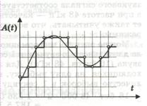 Таким образом, непрерывная зависимость амплитуды сигнала от времени A(t) заменяется на дискретную последовательность уровней громкости. На графике это выглядит как замена гладкой кривой на последовательность «ступенек»