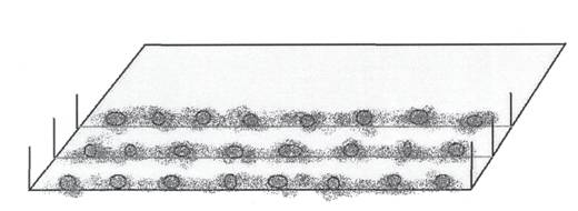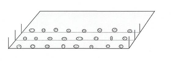 Технология посадки начинается с того, что на обозначенном нами участке по длинной стороне (рис.1) натягивается шпагат с помощью двух колышков. Ровно по шпагату клубни рукой втыкаются в почву на половину или 3/4 части. То есть, мы сажаем клубни по поверхности мягкой и обработанной почвы таким образом, чтобы были видны ряды посаженной картошки. Мы рекомендуем оставлять расстояния между рядами около 90 см. Однако могут быть и другие варианты, например, меньше (70-75, 75-80 см) или больше (90-95, 95-100 см). Расстояние между рядами более всего зависит от того, насколько плодородна почва на вашем участке, или от того, сколько органических удобрений будет вноситься в почву.