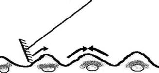 Технология выполнения данной операции следующая: граблями снимается почвенная корка и разрыхляется верхний, более твердый слой почвы, по гребню. Обработку почвы следует осуществлять снизу вверх (рис.4), что помимо главных функций (задержание влаги в почве, улучшение воздухообмена, активизация роста всходов) восстанавливает уровень гребня, то есть на прежнее место возвращается та часть плодородной почвы, которая была смыта дождями вниз в междурядья.