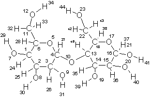 Для сравнительной оценки рассчитанных данных была проведена оптимизация геометрии молекулы мальтозы неэмпирическим методом в базисе STO-3G. Для этого была использована уже оптимизированная методом PM3 z-матрица структуры молекулы. Величина полной энергии приняла значение ,22 кДж/моль. Норма градиента остановилась на 0,000093 кДж/моль/ангстрем. На рисунке 3 видно, что в результате расчета неэмпирическими методами в базисе STO-3G в структуре молекулы происходит образование 4 водородных связей между атомами кислорода (O8, O10, O19, O20) и водорода (H29, H31, H34, H39).