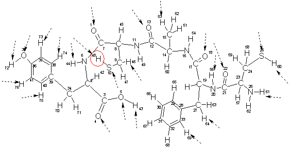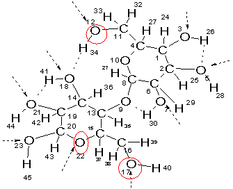 Рис.7. Реакционные центры оптимизированной молекулы мальтозы (показаны стрелками)