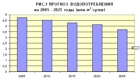 Рис. 1. Прогноз водопотребления на 2005 – 2025 гг. (млн. м3/сутки)