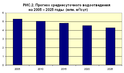 Рис.2 Прогноз среднесуточного водоотведения на 2005 – 2025 гг. (млн. м3/сутки)
