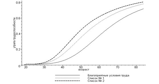 Рис. 2. Зависимость утраты трудоспособности от возраста и условий труда в математической модели.