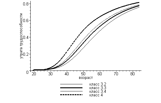 Рис. 3. Зависимость утраты трудоспособности от возраста и классов условий труда в математической модели.
