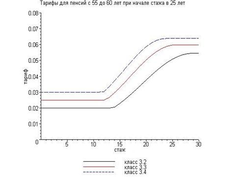 Зависимость тарифов для дополнительных пенсий, выплачиваемых с 55 до 60 лет, от класса условий труда для работников, стаж которых начинается в 25,лет (тарифы приводятся в долях от зарплаты).