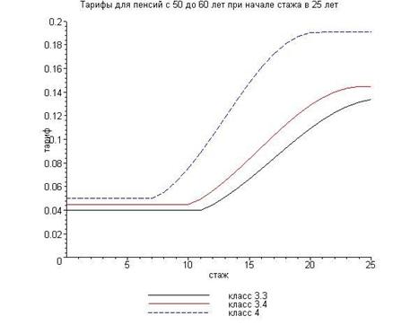 Зависимость тарифов для дополнительных пенсий, выплачиваемых с 50 до 60 лет, от класса условий труда для работников, стаж которых начинается в 25,лет (тарифы приводятся в долях от зарплаты).
